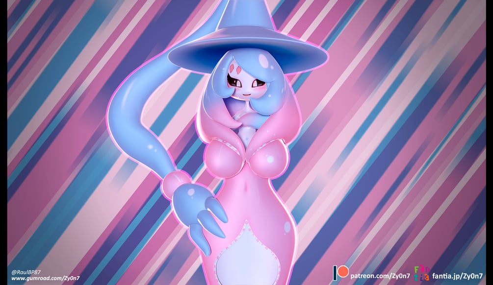 The 3d model tier includes everything from the exclusive psd set + a 3d .obj and .fbx model file of her in T pose (I pose? she doesn't have arms anyway) with both the fake body with all the clothing layers and her real small body hidden under her hair, which is split into strands that can cover or uncover her.