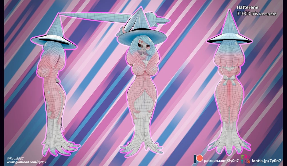 This set includes 14 3k resolution jpg renders of the fairy pokemon Hatterne in her evolved form. There are two variations one with her fake dress body made with her hair like seen in the game, and another with her true small body alone.