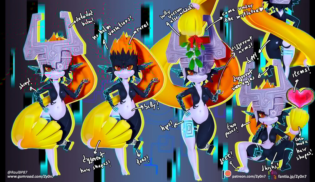 This jpg set includes 50 3k resolution jpg renders of Midna. There are two poses, one posing dynamically and another sitting. Both have different variations with hair shapes and accessories. All variations also feature her without helmet with both eyes and hair visible!