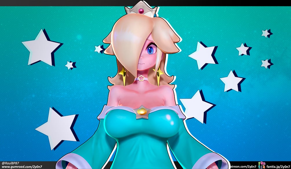 This set includes 70+ 3k+ resolution jpg renders of Rosalina in dress with her iconic hairstyle. Underneath she has gloves, stockings and pasties. There are lots of variations and view angles. Alternates with different faces etc. Lumas are also featured.