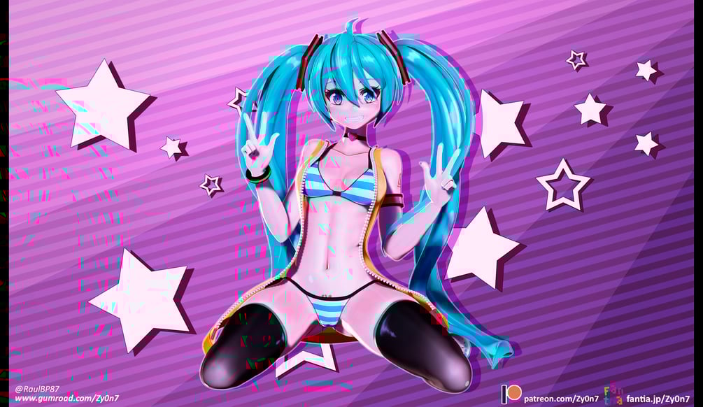 This jpg set includes 35+ 3k resolution jpg renders of Miku in a fresh bikini top with shorts and sleeveless jacket, with semi transparent thigh boots.
