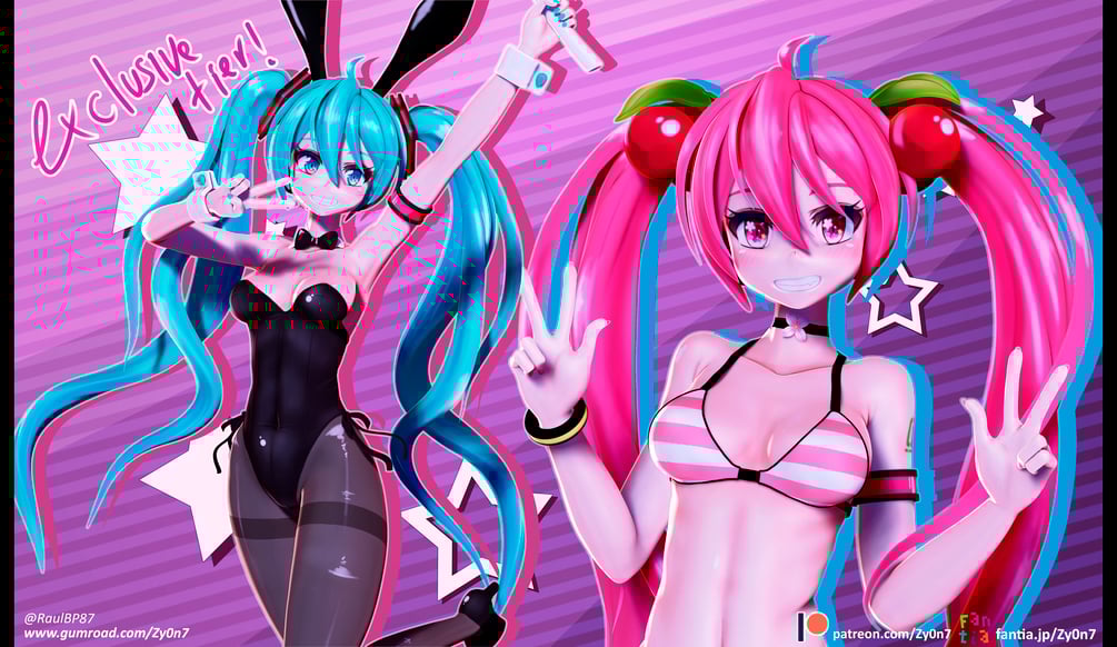 The exclusive psd set includes everything in psd files at 6k+ resolution with all layers and masks intact plus a whole new set of her in a bunny suit with high heels and stockings, and a pink sakura miku variant too with different colors and completely different eyes. For a total of 54 UHD psds