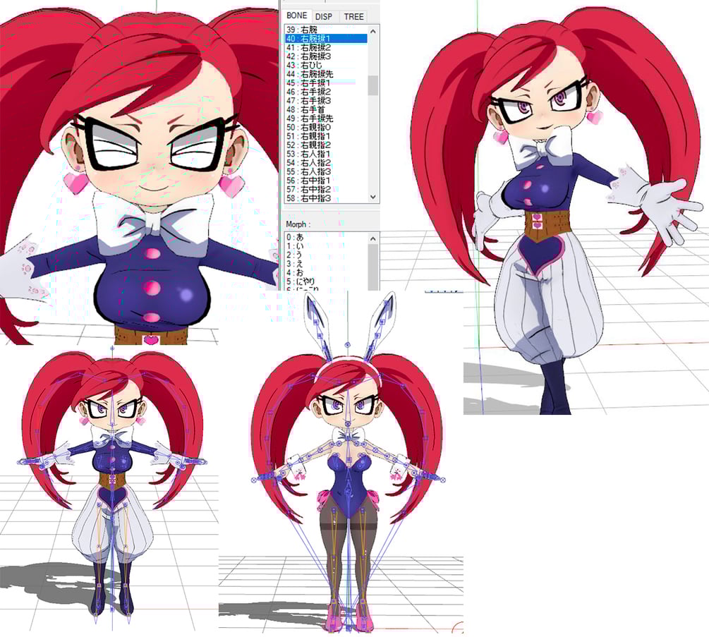 This model now also includes a .pmx conversion with rig for MMD. This was graciously provided by a 3rd person(RWBYMMD) that shared his own conversion work. As such these extra files are provided as is and no guarantees or support is provided about them. Both the uniform and bunnysuit versions are included with some face morphs.