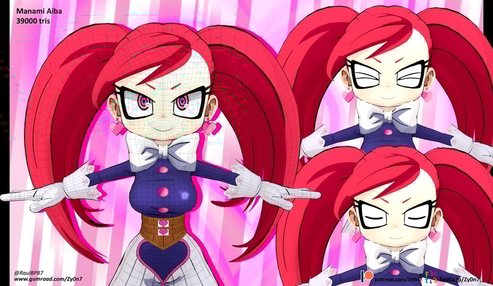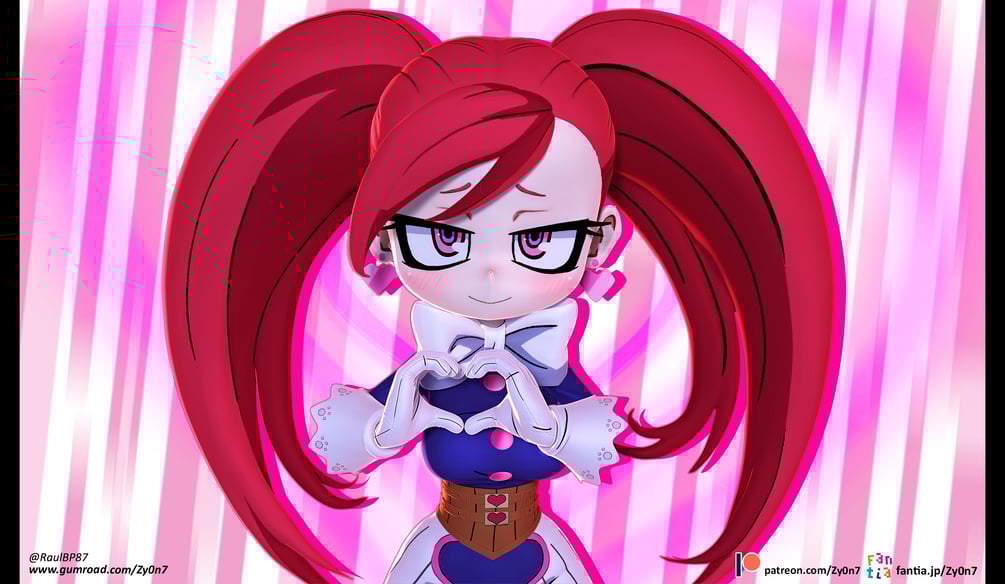 This set includes 30+ 3k resolution jpg renders of short 'villain' Manami Aiba - La Brava in her iconic outfit. Featuring two poses, posing shy making a heart shape with her hands and happy cheering and filming. There is also a bunnysuit variation that gives her a very different feel!