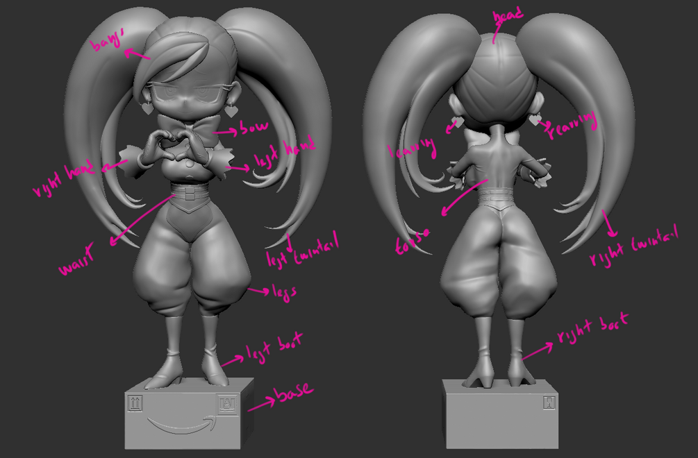 The 3d print tier includes everything from the psd set + STL files for 3d printing her in the heart shape pose, already split into different parts for easy print and assembly, includes assembly and color references. The base is a cardboard box because she is short.