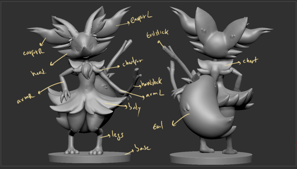 Regular fur body (Flat& chest bodies, flat& chest yellow fur 'skirt', tail, chest fur, stick)