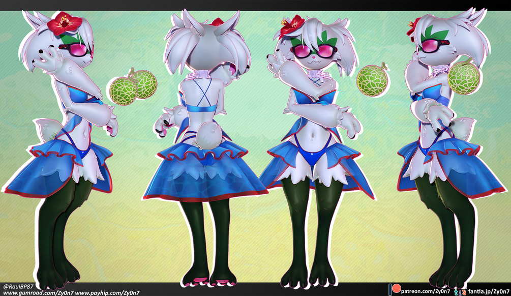 - Beach outfit (flower ornament, sunglasses, swimsuit, frills and pareo skirt, melon)