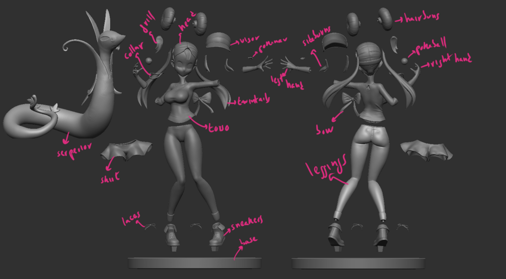 *model file in T pose (obj, fbx) ~63k tris (depending on outfit, accessory and hairstyle combinations), includes regular twintail and ponytail hairstyles, trainer outfit (leggings, pink top with bow, skirt, shade visor, pokeball, pokenav bracelet, sneakers and shirt) Please note serperior is not included in the model data. All pieces are removable, fully modeled and separate so any combination of them or total removal is possible. Textures in psd and png formats for max quality 4k, including 2 slightly different color variations of each texture (in the psd file).