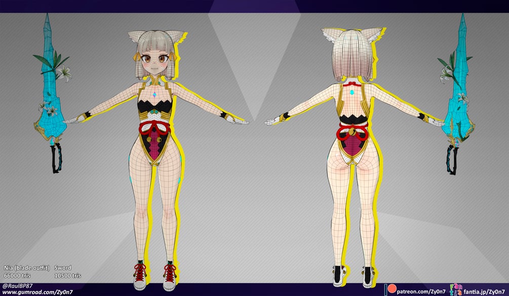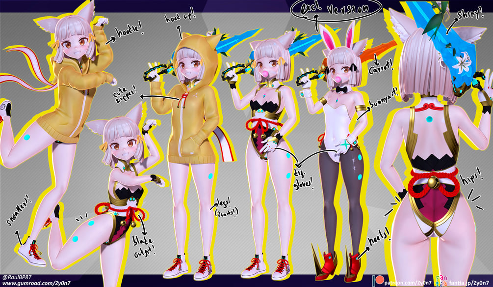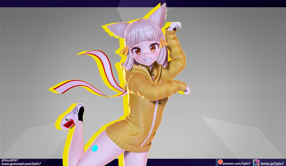This jpg set includes 40+ 3k resolution renders of Xenoblade's 2 Nia in a special mix of both her forms, with the normal hairstyle and ears but with the blade form dress under a yellow hoodie, also with cool sneakers! Two poses featured, doing her cat dance and posing cool with her sword chewing bubblegum. Both poses include variations such as hoodie up, down, without hoodie, only with the gold trims... the dance pose also has a special variation in red ropes and golden bells