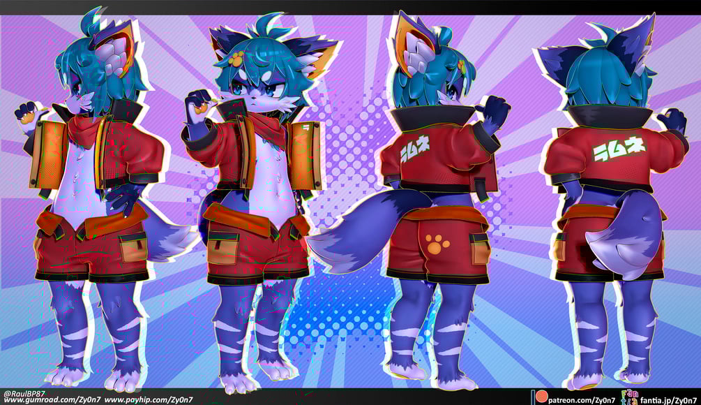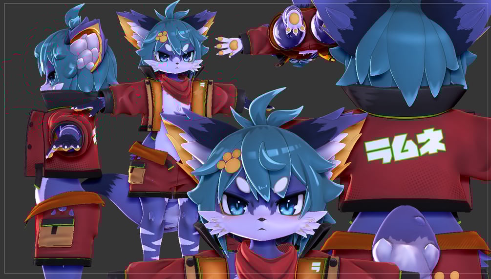 This model includes an avatar for VRChat (includes many features such as removable clothing, removable fur accents, puppets for ears and tail, adjustable glowing outline, music sync glowing eyes & more) these are bonus files and provided as is, no guarantee or support is provided. Avatar is for private use and is not allowed to be uploaded publicly. More info on the readme file.